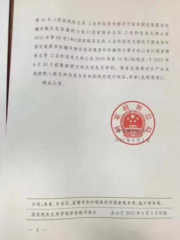 關(guān)于之前一直眾說紛紜的,環(huán)衛(wèi)車將2017年7月1日專用車取消免稅說法,現(xiàn)在國家稅務(wù)總局的正式文件已經(jīng)下發(fā), 已證實(shí), 并不是取消專用車免稅政策, 只是從7月1日起更換免稅圖冊(cè), 新的免稅圖冊(cè)沒有下來之前不能辦理免稅 ,所以請(qǐng)需要購新車的客戶提前訂車, 避免造車麻煩 ,環(huán)衛(wèi)車購置稅免征情況說明1、《歷史免稅圖冊(cè)》(2005年1月-2016年5月下發(fā)的《免稅圖冊(cè)》)將于2017年7月31日停止執(zhí)行。2、《歷史免稅圖冊(cè)》中的免征車型由車輛生產(chǎn)企業(yè)于2017年6月30日前重新提交相關(guān)信息與資料進(jìn)行審核,更新《免稅圖冊(cè)》。原文如下: