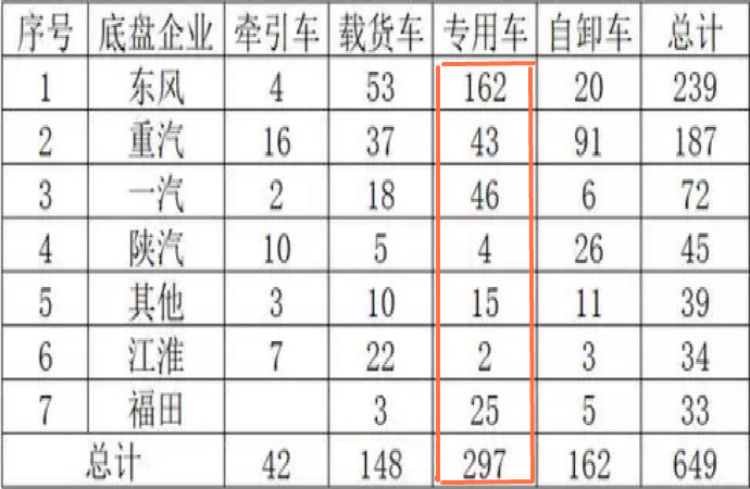 橫向比較幾款整車可以發(fā)現(xiàn),牽引、載貨、自卸大多為主機廠自己申報,而國六專用車產品多為改裝廠申報,所以是“兵家必爭之地”。