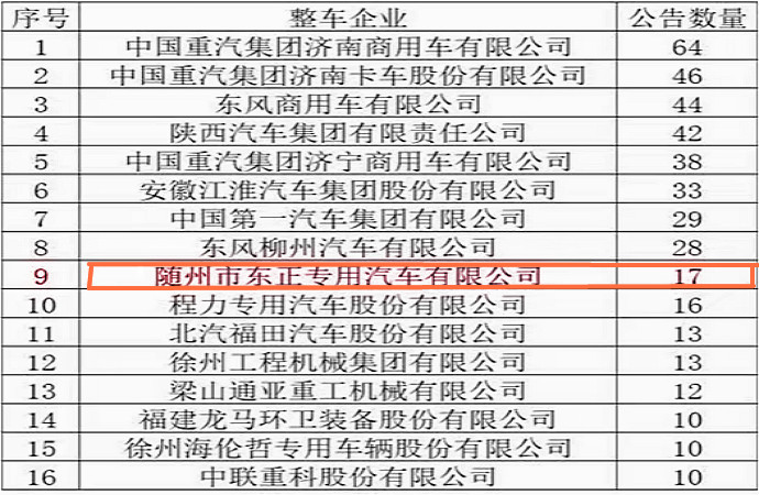 對于整車公告而言,本批國六重卡公告數(shù)量10個以上的企業(yè),共計16家,主機廠占據(jù)主流,重汽濟南商用車、重汽濟南卡車東風商用車公司分列前三名。改裝廠中,隨州東正汽車排名靠前。
