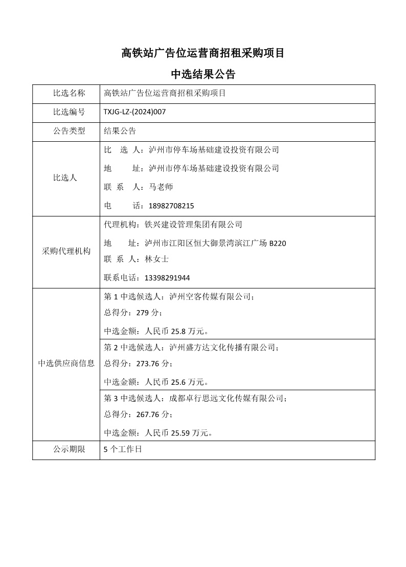 高鐵站廣告位運(yùn)營商招租采購項(xiàng)目中選結(jié)果公告
