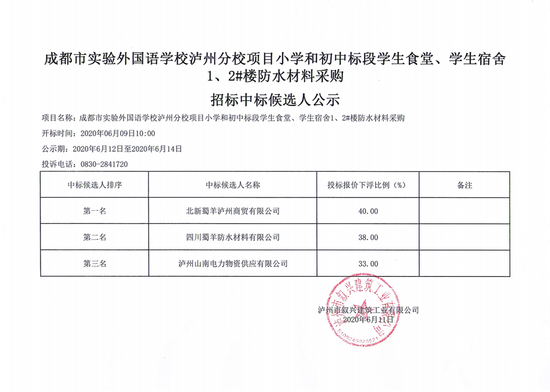 成都市實驗外國語學校瀘州分校項目小學和初中標段學生食堂、學生宿舍1、2#樓防水材料采購中標候選人公示 作者: 來源: 日期:2020-06-11 瀏覽次數(shù): 次 【字體:小 大】 【打印正文】